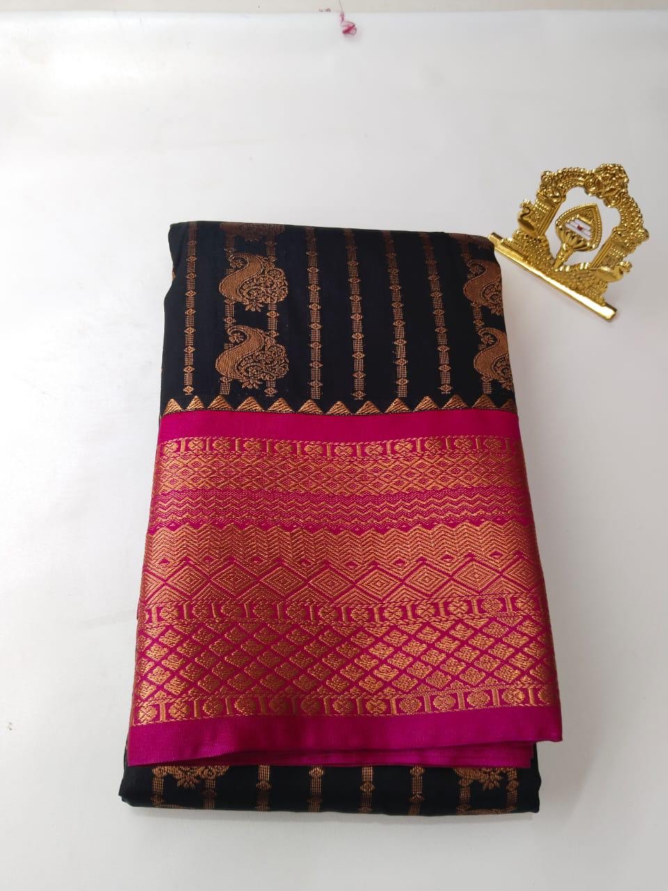 A Vaira Oosi soft silk saree is a handloom silk saree with a distinctive, intricate “needle-like” gold or silver zari pattern throughout the body, which is soft and lightweight, making it comfortable to wear while still conveying a luxurious and traditional appeal. It is perfect for special occasions, featuring a detailed pallu and border with rich zari weaving.